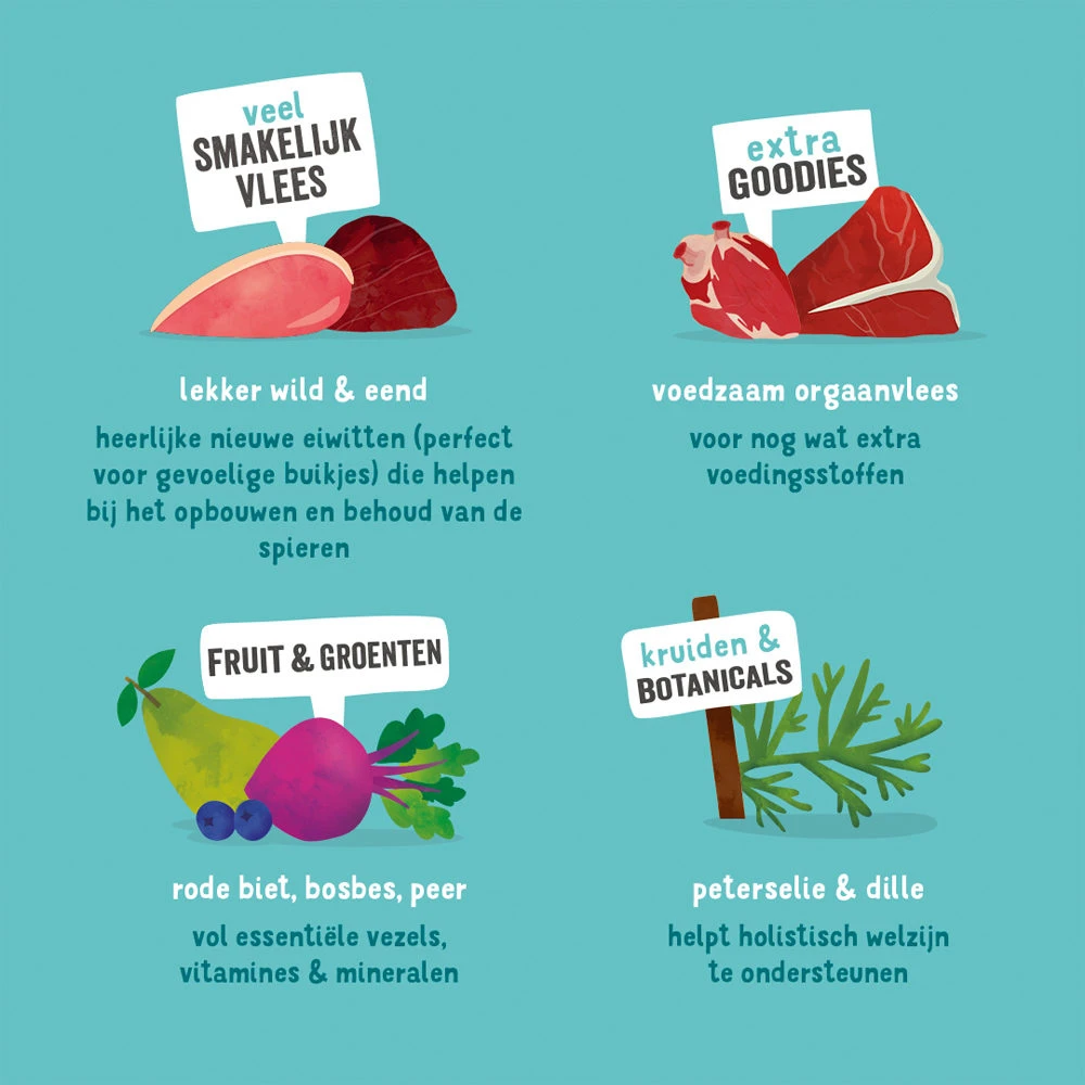 Adult – Wild & Eend is speciaal samengesteld volledig natvoer voor uw volwassen hond. Het graanvrije recept bevat wild en eend. Dit vlees is niet bewerkt, overgaar of gedroogd. Dat zou namelijk moeilijker te verteren zijn voor uw hond. Adult – Wild & Eend bevat bovendien een heerlijke mix van gezonde groente, fruit en kruiden.