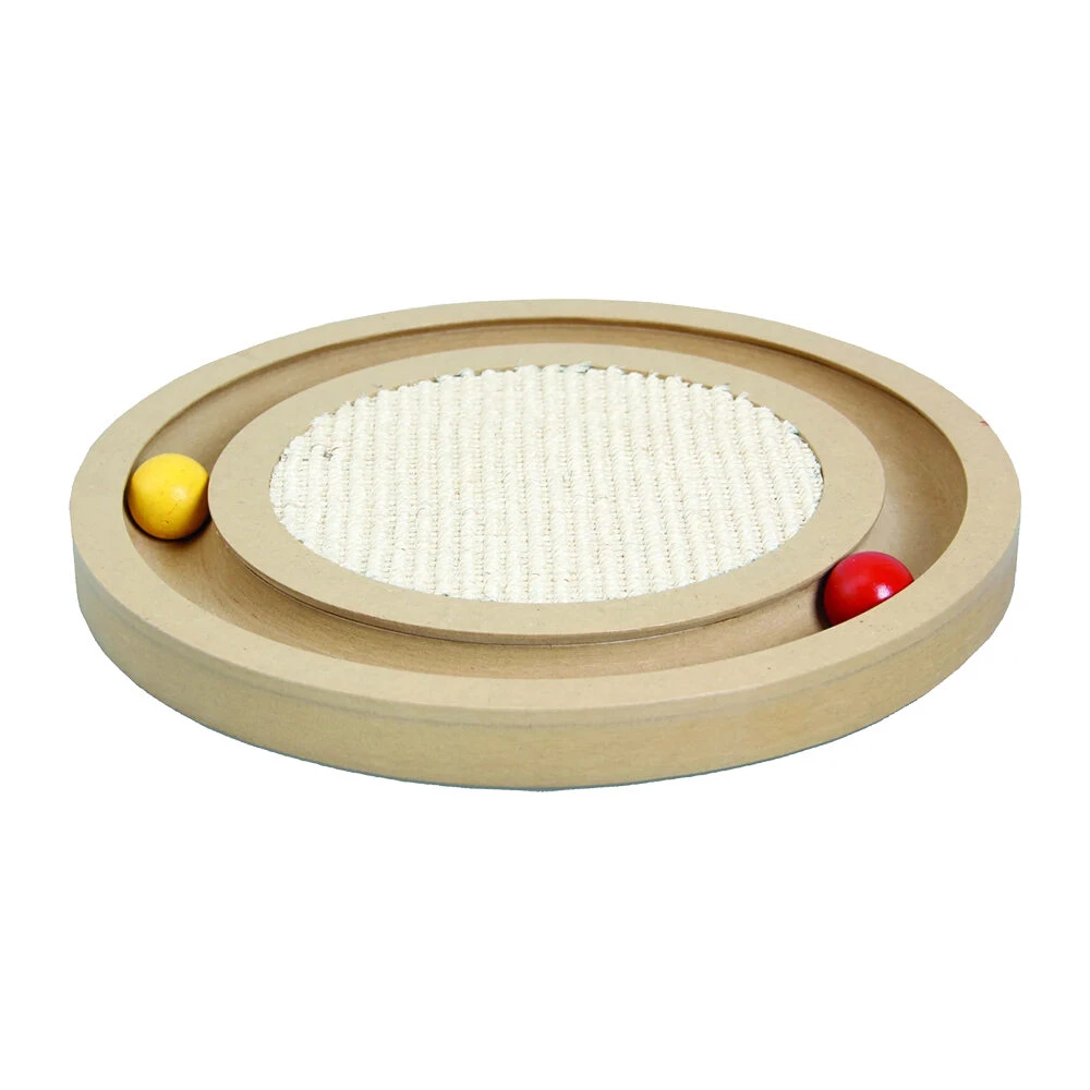 Dit houten kattenspeelgoed is een combinatie van een krabbord en een ballenbaan. De ballen zitten vast in het speelgoed, waardoor ze nooit kwijtraken. Het krabbord heeft rubberen voetjes zodat het bord niet verschuift.