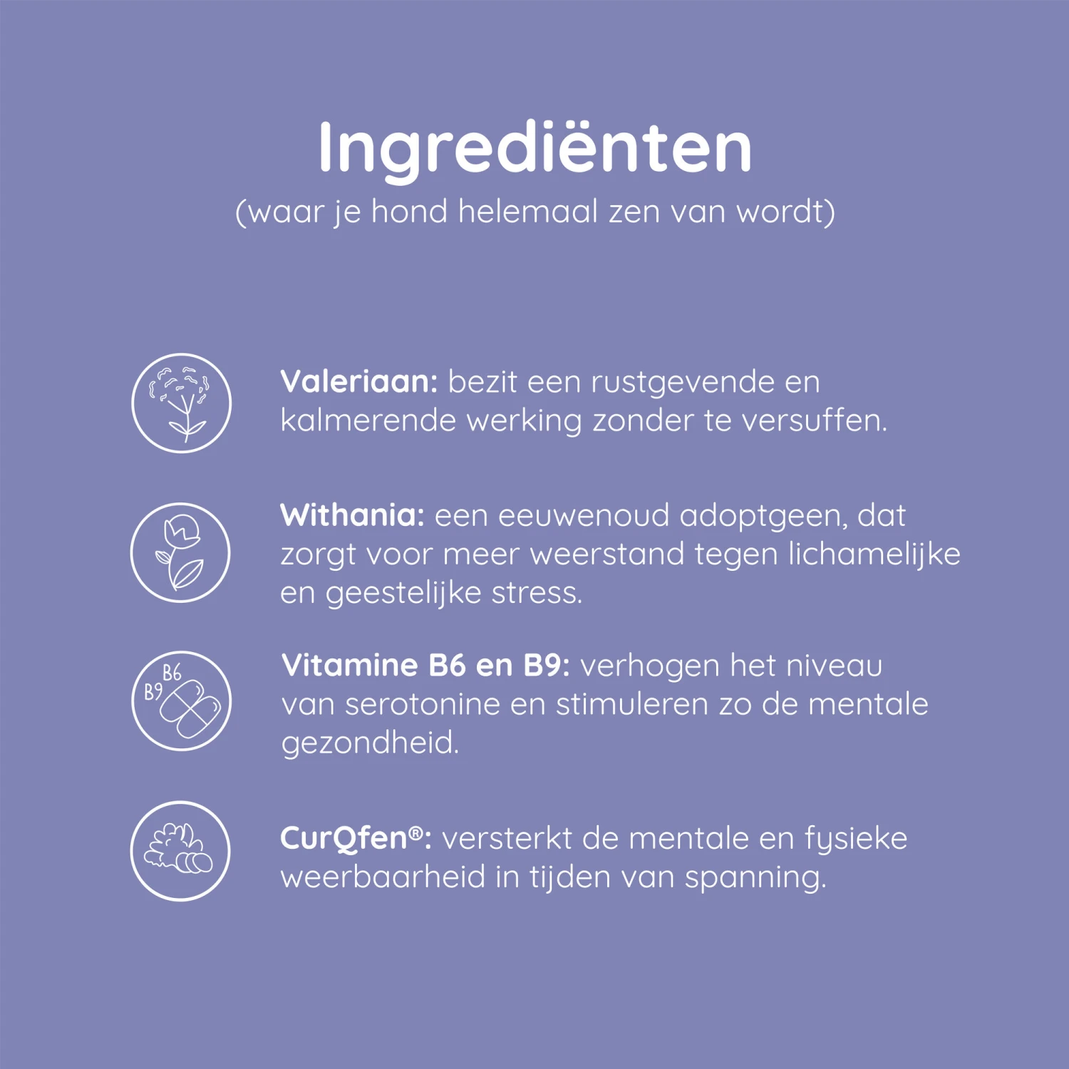 Geschikt om te gebruiken tijdens stressvolle situaties, zoals nieuwsjaarnacht, verhuizen, dierenarts of reizen Capsule samengesteld met gepatenteerde ingrediënten, waaronder Valeriaan. Vitamine B6 en B9 Effect zichtbaar na 4 tot 5 dagen Geschikt voor alle leeftijden inclusief puppy’s Makkelijk toe te dienen capsulevorm of te mengen met voeding