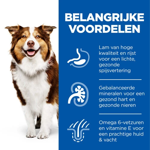 Hill’s Science Plan – Mature/Adult – Medium – Lamb & Rice is speciaal samengesteld om een goede spijsvertering en een goede mobiliteit van uw hond te ondersteunen. Dit droogvoer van Hill’s draagt bij aan een gezonde huid en vacht, door middel van de Omega 6-vetzuren en Vitamine E in de voeding. De gebalanceerde mix van ingrediënten en mineralen in het hondenvoer zorgen ervoor dat het energie- en activiteitsniveau van uw oudere hond wordt ondersteunt!