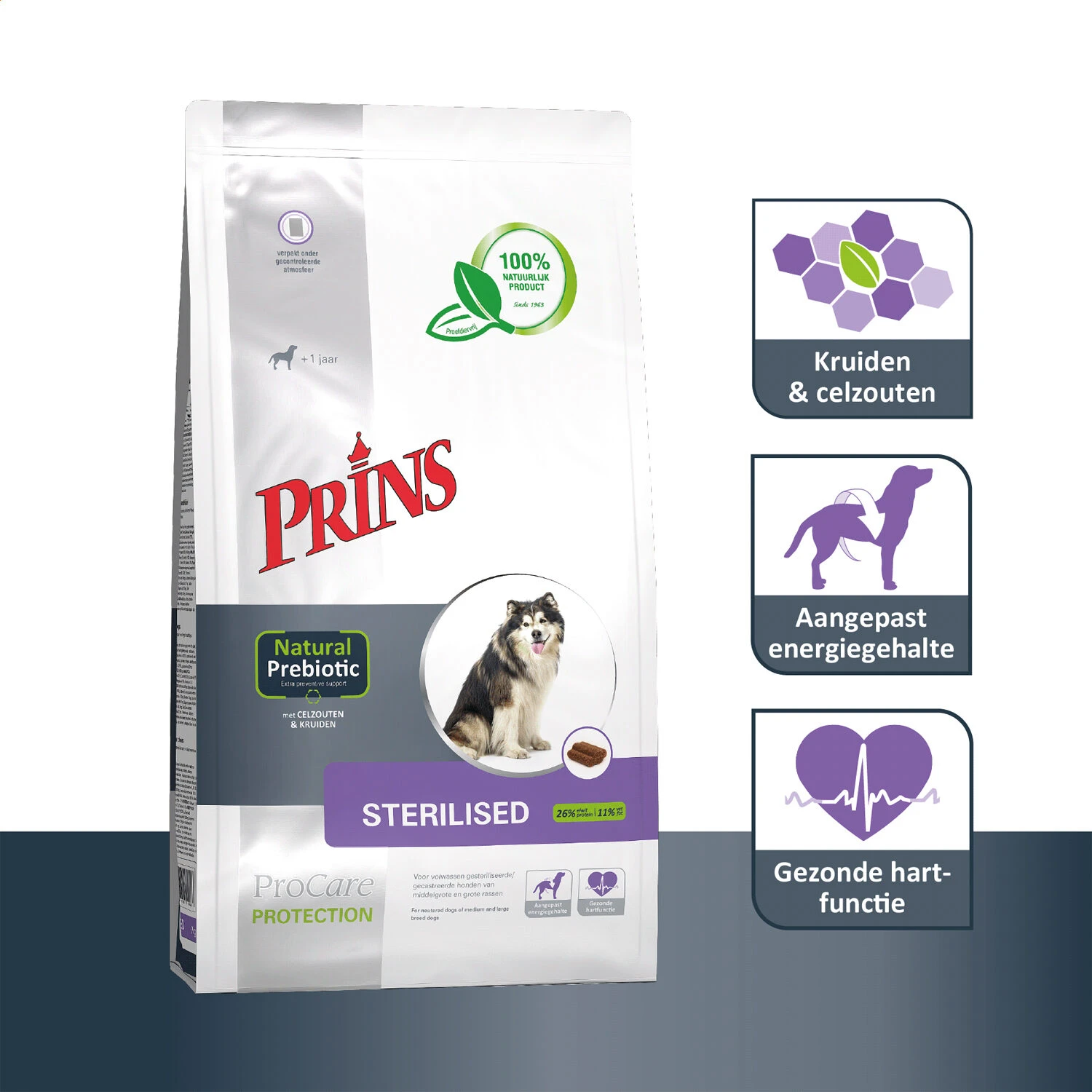 Honden die gesteriliseerd of gecastreerd zijn hebben vaak de neiging om aan te komen in het gewicht. De ProCare Protection Sterilised van Prins bevat een aangepast energiegehalte om uw hond te helpen op een gezond gewicht te blijven. De voeding kan ook goed gegeven worden als uw hond niet is gecastreerd/gesteriliseerd maar wel een lagere energiebehoefte heeft met neiging tot overgewicht. De extra voedingsvezels zullen zorgen voor een vol/verzadigd gevoel om zo het gezonde gewicht van de hond te handhaven. Voor de juiste ondersteuning van het lichaam zijn ingrediënten als zalmolie, FOS, kruidenextracten en Schüssler celzouten, glucosamine en chondroïtine toegevoegd.