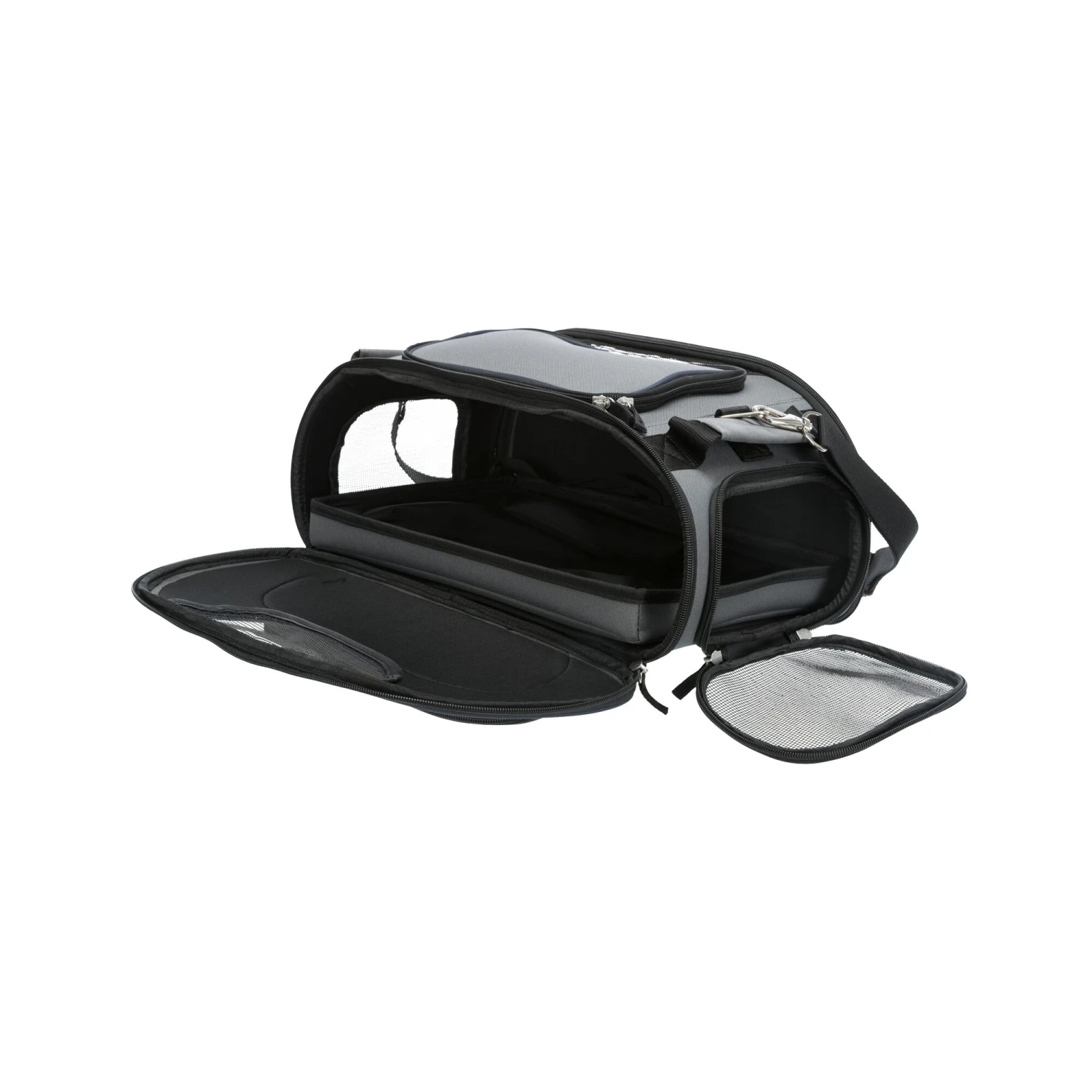 Met de Airline Tas Wings van Trixie kunt u met uw hond op een handige en veilige manier op reis met het vliegtuig. Het formaat van de tas wordt namelijk bijna bij alle luchtvaartmaatschappijen geaccepteerd. De tas is te bevestigen aan de trolley en kunt u openen aan de voor-, zij- en bovenkant. U kunt de Airline Tas tillen aan de twee handgrepen en aan de schouderriem. De bodemplaat is gevoerd, waterdicht en uitneembaar. Bovendien is de tas gemaakt van vormvast polyester en bevat het een buitenvak.